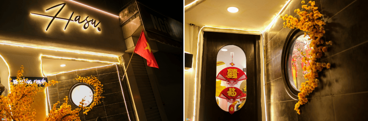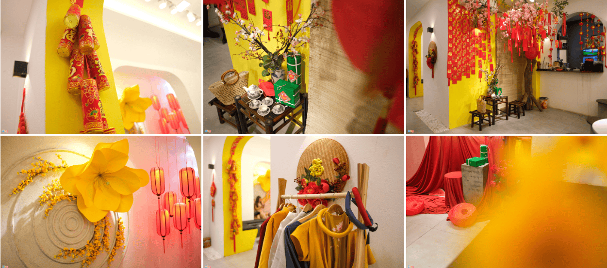 Quán cà phê nhỏ, một tầng này gây ấn tượng mạnh cho khách bởi tông màu đen, trắng hiện đại. Dù không gian nhỏ, quán lại có khá nhiều góc chụp ảnh đẹp. Cành mai vàng vòng quanh ô cửa sổ tròn ngay lối vào là một ví dụ. Bên trong, quán được chia làm hai khu để khách uống cà phê. Quán khá vắng nên việc chụp ảnh không gặp quá nhiều khó khăn. Các góc chụp Tết bên trong chia làm hai tông chính là đỏ và vàng. Theo đánh giá của phóng viên, góc màu vàng với hoa mai được thiết kế đẹp hơn, lên hình khá sang. Ngoài ra, quán này cũng hỗ trợ cho thuê đồ chụp ảnh.
